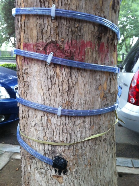 石家莊匯通路上一商家給門前的多棵法國(guó)梧桐樹纏上了燈帶,并以釘釘子的方式加以固定。每棵樹的樹身均密密麻麻地遍布釘子, 據(jù)“屌絲變學(xué)霸”目測(cè),每棵樹至少被釘30顆釘子。